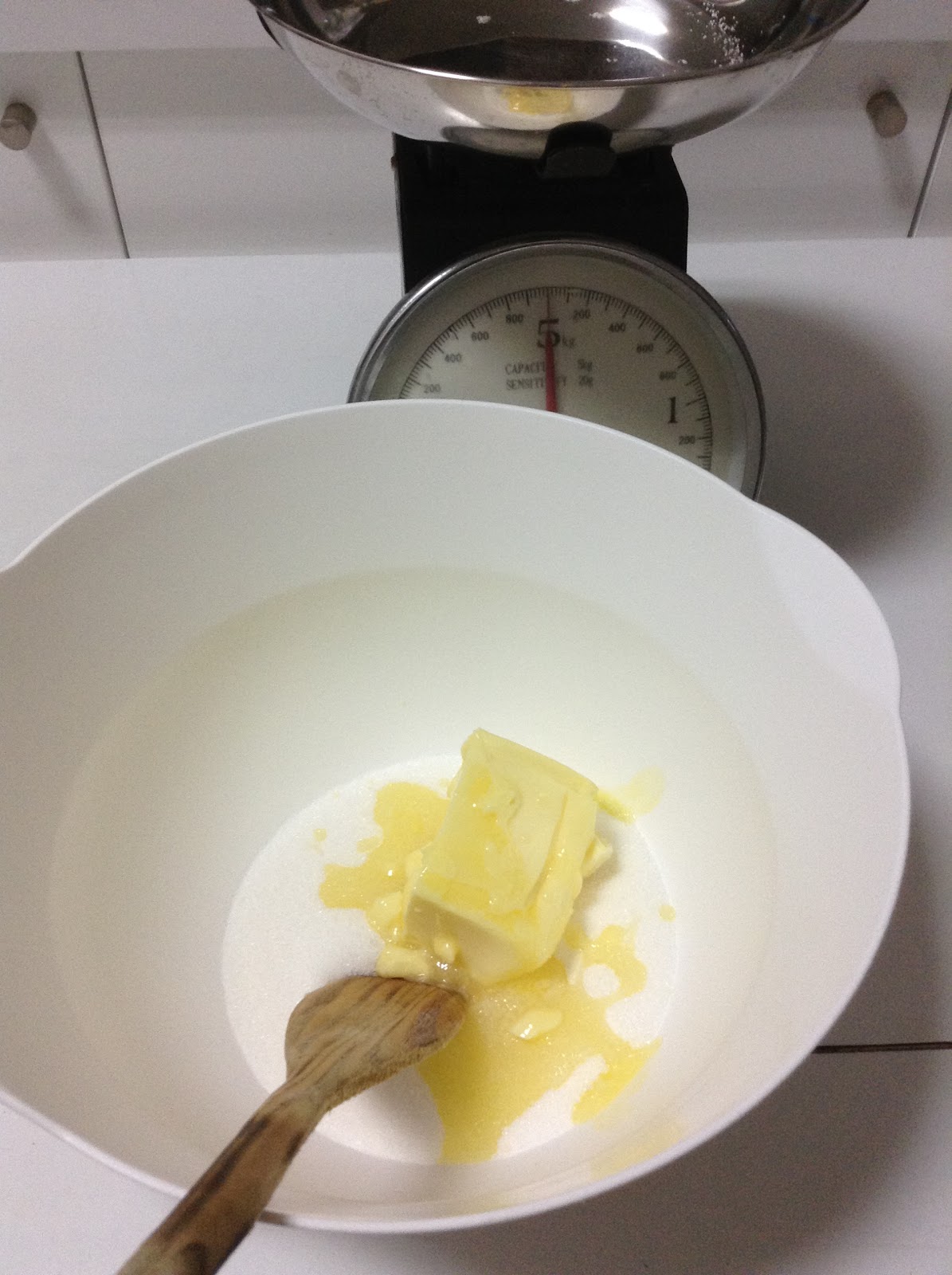 Bate-se 125 g. de margarina  com 250 g. açúcar.